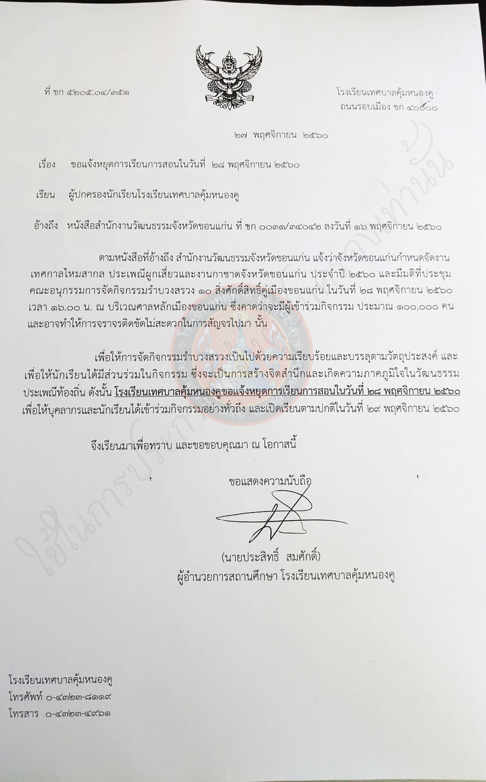 ประกาศปิดเรียนวันที่ 28 พ.ย. 2560