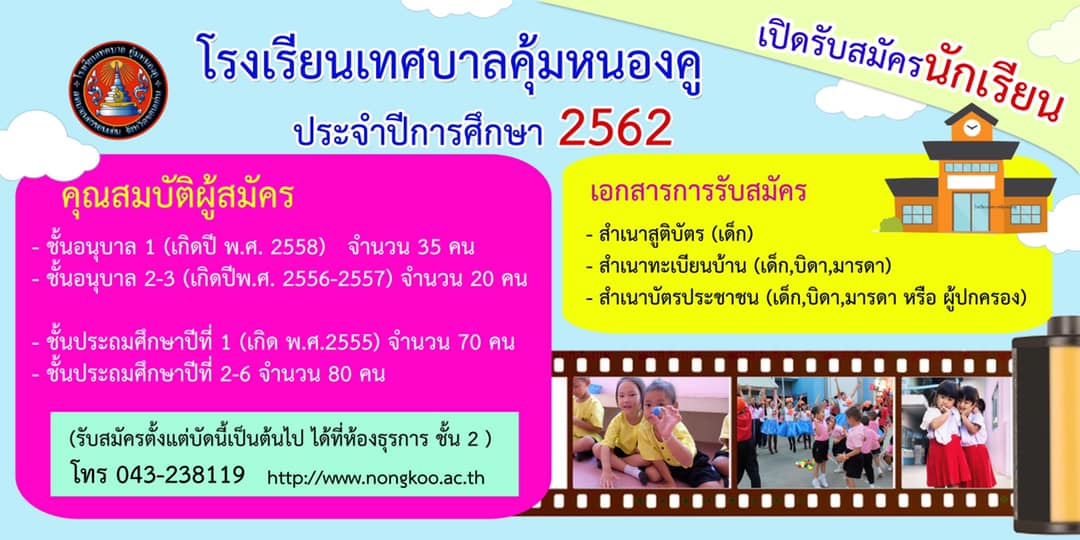 โรงเรียนเทศบาลคุ้มหนองคูเปิดรับสมัครนักเรียนเข้าเรียนประจำปี 2562