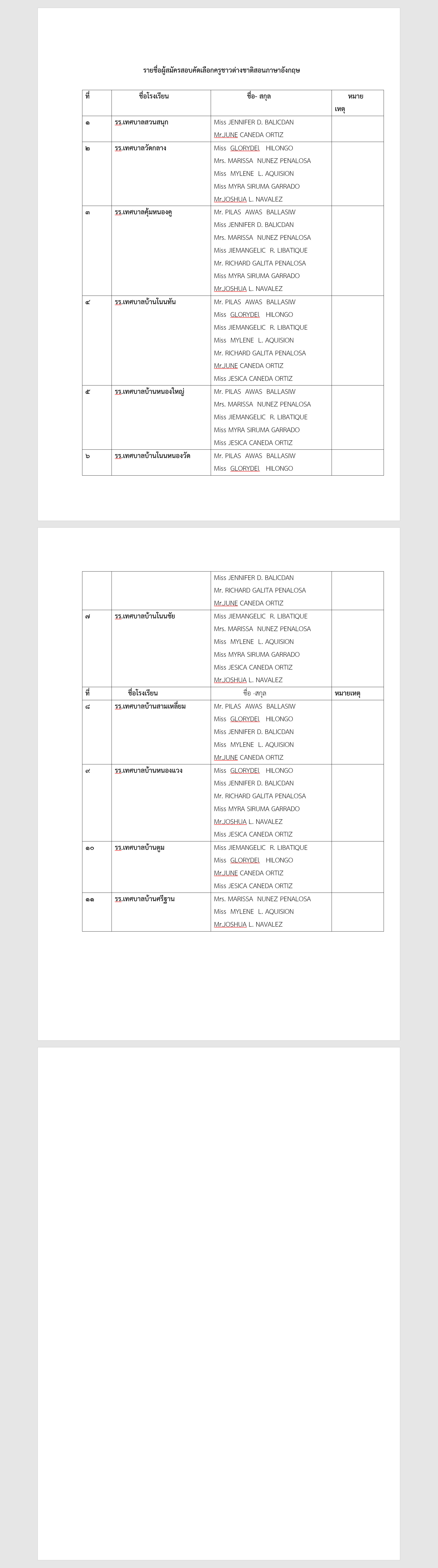 รายชื่อผู้สมัครสอบคัดเลือกครูชาวต่างชาติสอนภาษาอังกฤษ