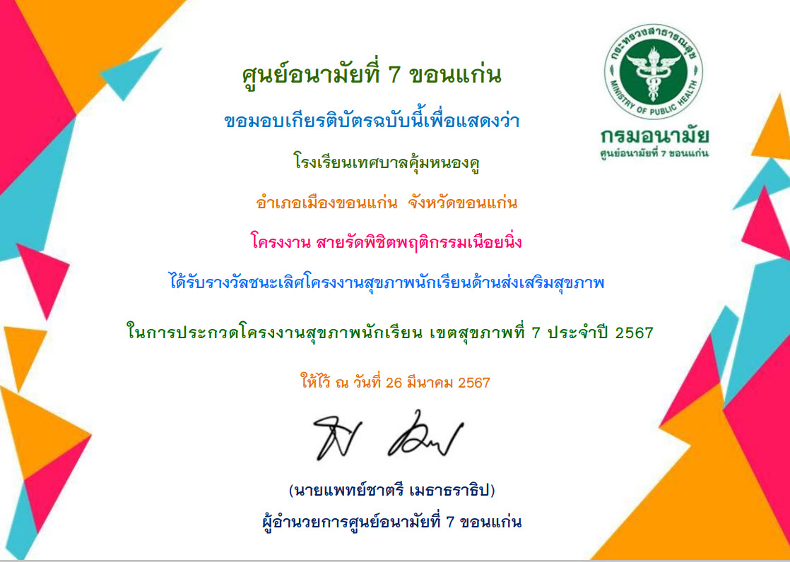 โรงเรียนเทศบาลคุ้มหนองคูได้รับรางวัลชนะเลิศอันดับที่ 1 ในการประกวดโครงงานสุขภาพนักเรียน ด้วยโครงงานนวัตกรรม "สายรัดข้อมือพิชิตพฤติกรรมเนือยนิ่ง" ได้รับรางวัลโล่เชิดชูเกียรติจากกรมอนามัยและเกียรติบัตรจากศูนย์อนามัยที่ 7 ขอนแก่น