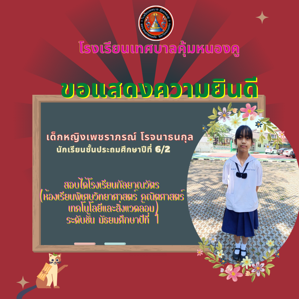ขอแสดงความยินดีกับ เด็กหญิงเพชราภรณ์ โรจนาธนกุล (น้องเพชร) นักเรียนชั้นประถมศึกษาปีที่ 6/2 สอบเข้าโรงเรียนกัลยาณวัตร (ห้องเรียนพิเศษวิทยาศาสตร์ คณิตศาสตร์ เทคโนโลยีและสิ่งแวดล้อม)ระดับชั้น มัธยมศึกษาปีที่ 1