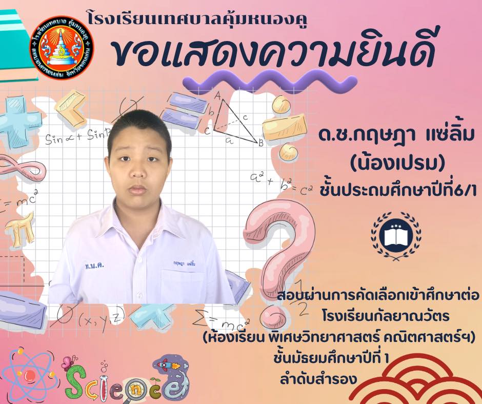 โรงเรียนเทศบาลคุ้มหนองคู ขอชื่นชมและแสดงความยินดีกับ ด.ญ.ศรัญย์ภัธ เครือแสง (น้องชินชิน) ชั้นประถมศึกษาปีที่6/2 สอบผ่านการคัดเลือกเข้าศึกษาต่อโรงเรียนกัลยาณวัตร (ห้องเรียน GIFTED ภาษาจีน) ชั้นมัธยมศึกษาปีที่ 1