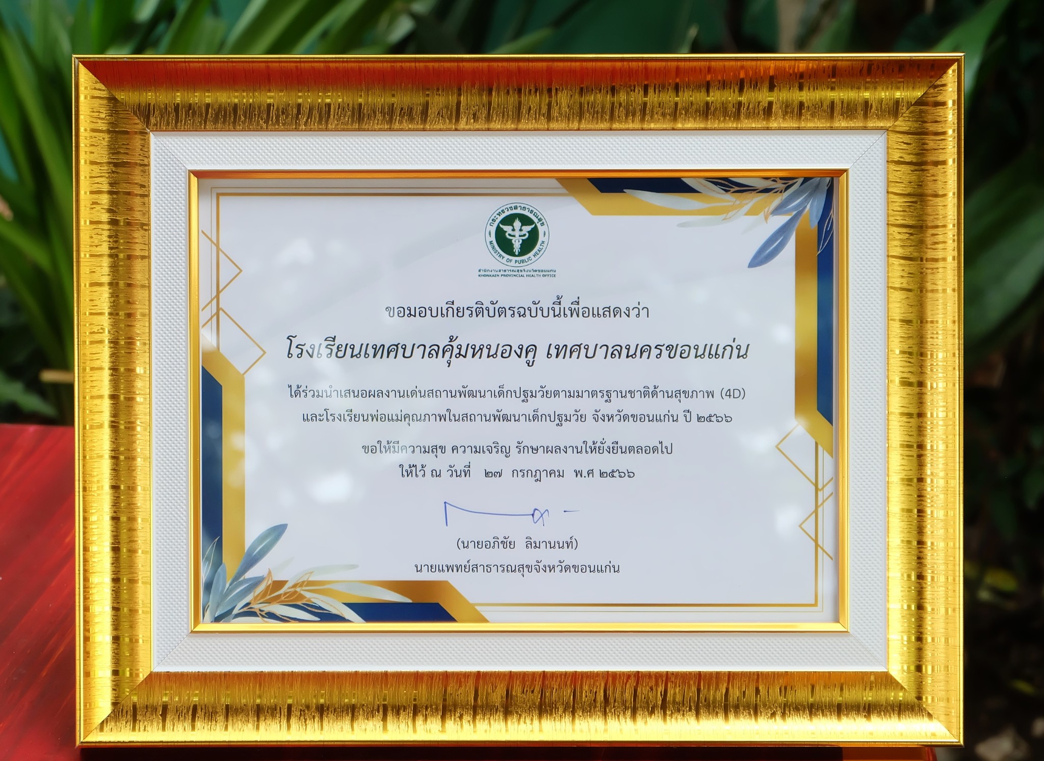 โรงเรียนเทศบาลคุ้มหนองคูรับใบประกาศเกียรติคุณที่ได้ร่วมนำเสนอผลงานเด่นสถานพัฒนาเด็กปฐมวัยตามมาตรฐานชาติด้านสุขภาพ (4D) และโรงเรียนพ่อแม่คุณภาพในสถานพัฒนาเด็กปฐมวัย จังหวัดขอนแก่น ปี 2566