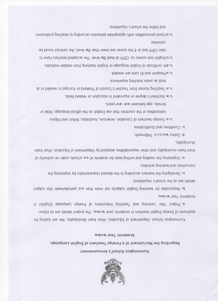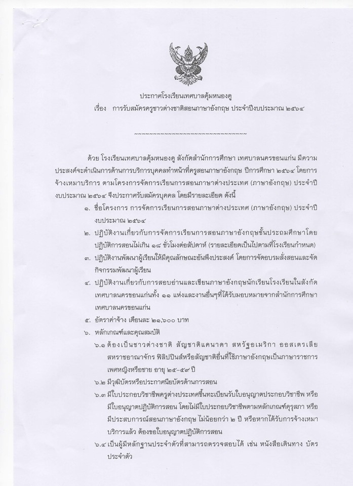 ประกาศรับสมัครครูชาวต่างชาติประจำปี2564