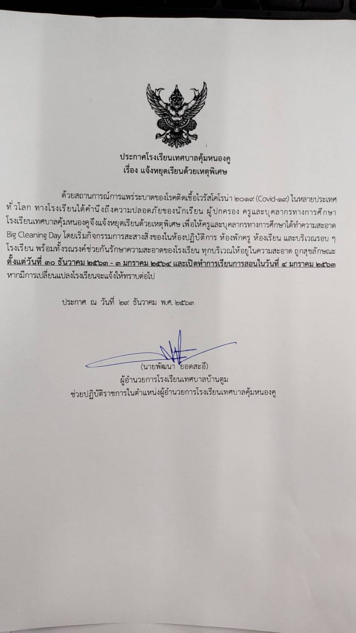 ประกาศปิดเรียนกรณีพิเศษ Covid-19